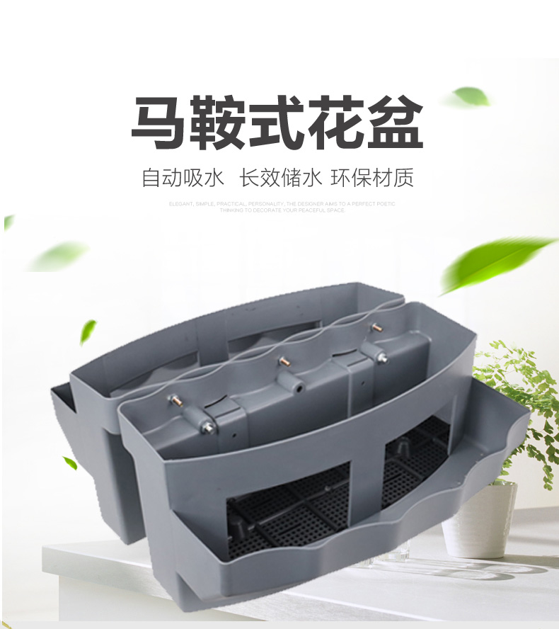 馬鞍花盆產(chǎn)品的特點及用途:每個花箱都有上下種植層室,使立體景觀效果更加飽滿。花箱分為含水層和種植層,植物可以通過地表帶或植物虹吸現(xiàn)象從含水層吸收水分,大大降低了維護(hù)成本,充分利用了雨水。兩個花箱左右組合時,可以騎在護(hù)欄上,可以根據(jù)護(hù)欄的寬度自由調(diào)節(jié),立體感更強(qiáng)??蓮V泛用于綠化護(hù)欄、窗臺和陽臺、墻體和擋土墻、圍欄、防撞墻和人行天橋。