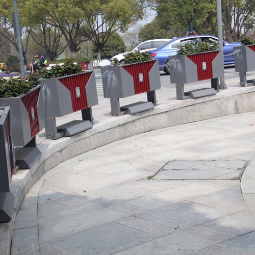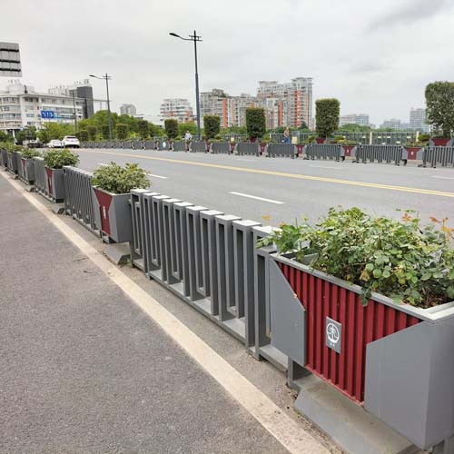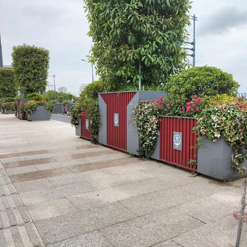 森格物中國紅鐵藝道路鈑金花箱廣泛應用于中央隔離/機非隔離/學校/會所/花園小區(qū)/售樓中心