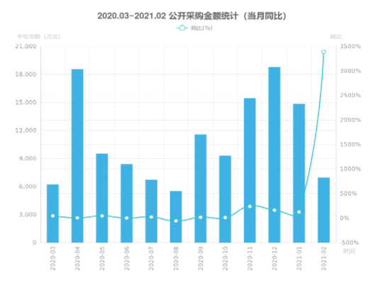 從金額的角度看上述統(tǒng)計數(shù)據(jù):根據(jù)中國昭章的統(tǒng)計,到2021年2月,所有有關(guān)投標的信息中包含“花箱”一詞的中標事件的數(shù)量 與2020年相比,中國的獲勝項目為人民幣6951.85萬元.2月,同比增長3385.0%。
