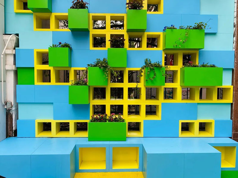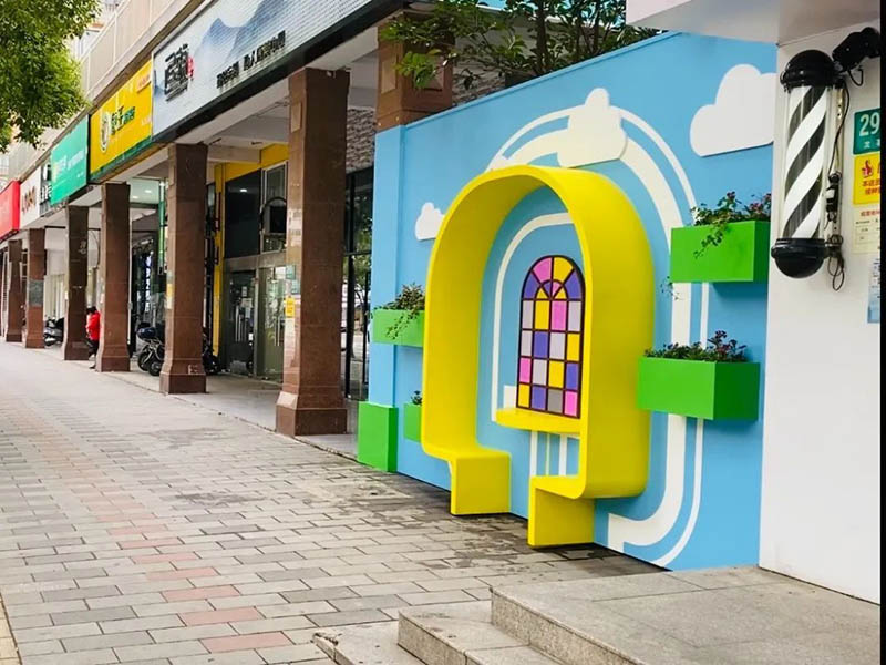 檸檬黃、玫瑰紅、孔雀藍(lán)……全新的“街道名片墻”選取歡快的色彩、色調(diào)和同色系的色譜,為生活增添了一道跳躍的美好。